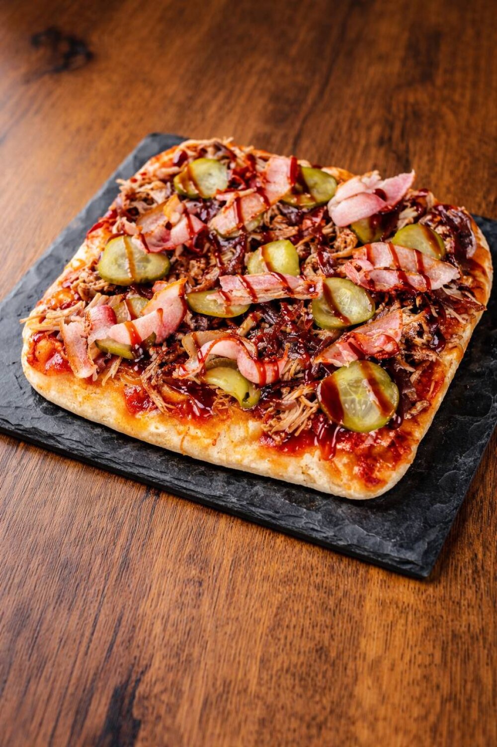 Рваная свинина,бекон,соус барбекю,лук карамельный,маринованный огурец