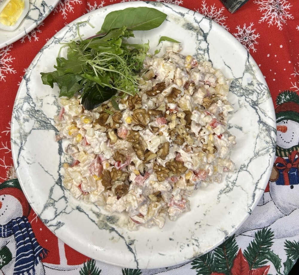 Филе куриное,ананас,кукуруза,сыр,перец болгарский,майонез,грецкий орех