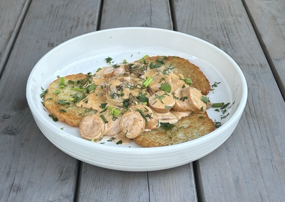 Драники с грибами и колбасками в сливочном соусе