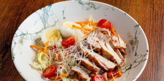 Микс салат,королевские креветки ,соус цезарь ,яйцо ,картофель пай ,черри ,пармезан